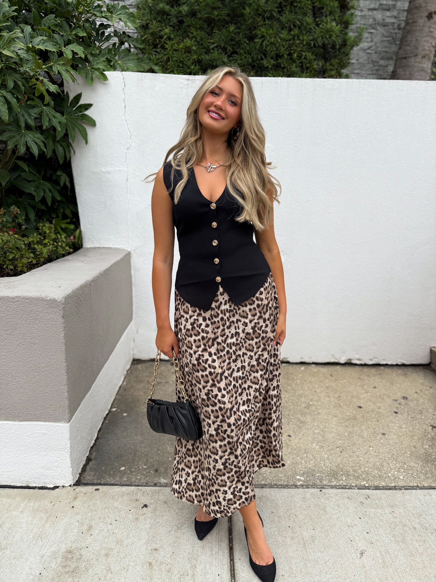 Unleash your bold side with our Autumn Wild Midi Skirt. Featuring a chic leopard print in warm neutral tones, this flowy skirt strikes the perfect balance between fierce and feminine. Designed with a flattering mid-length cut, it drapes effortlessly for a comfortable yet elevated look. Pair it with a simple tank or knit for daytime chic, or style with heels and gold jewelry for a night out. A versatile statement piece that never goes out of style.Â