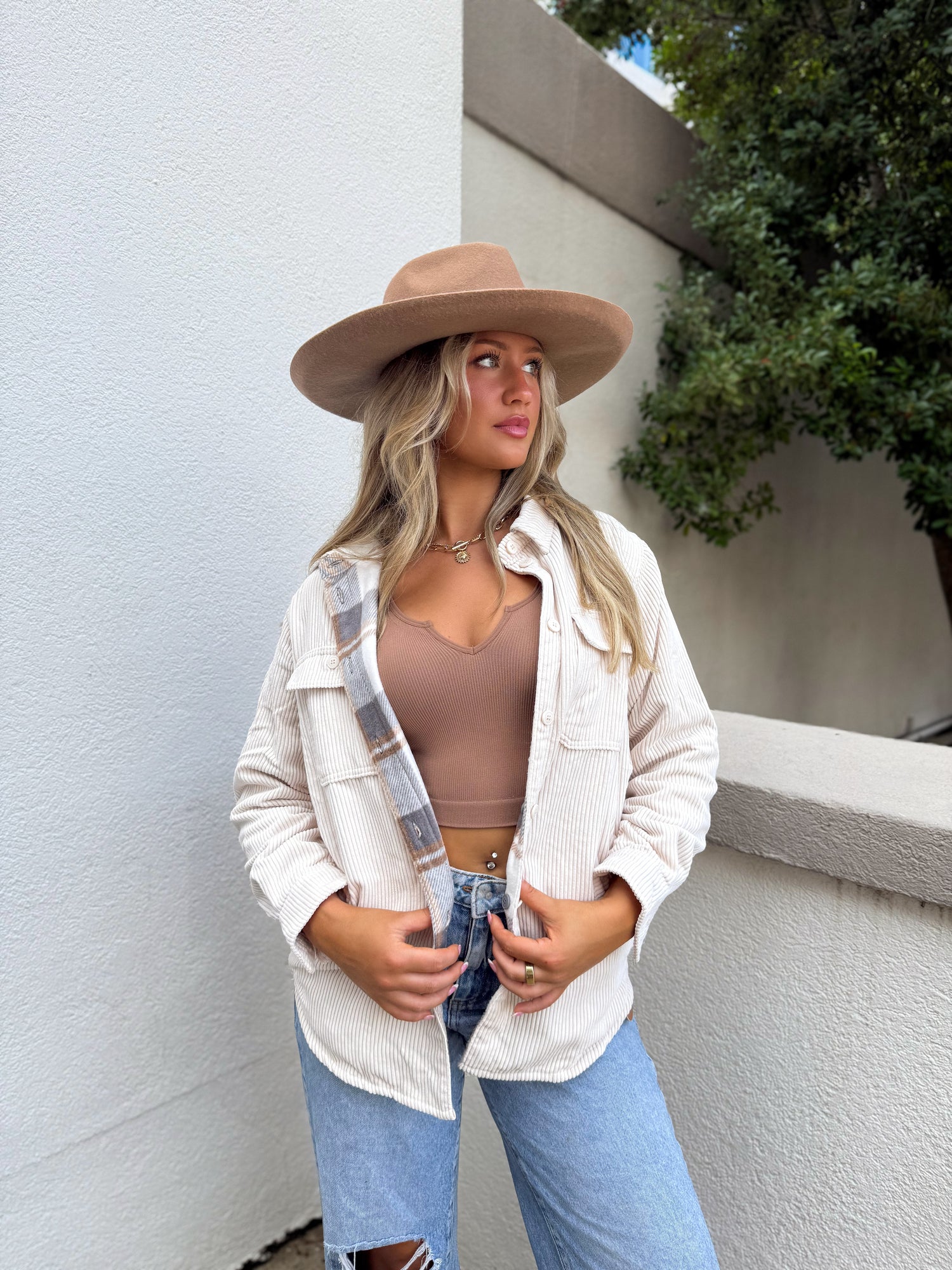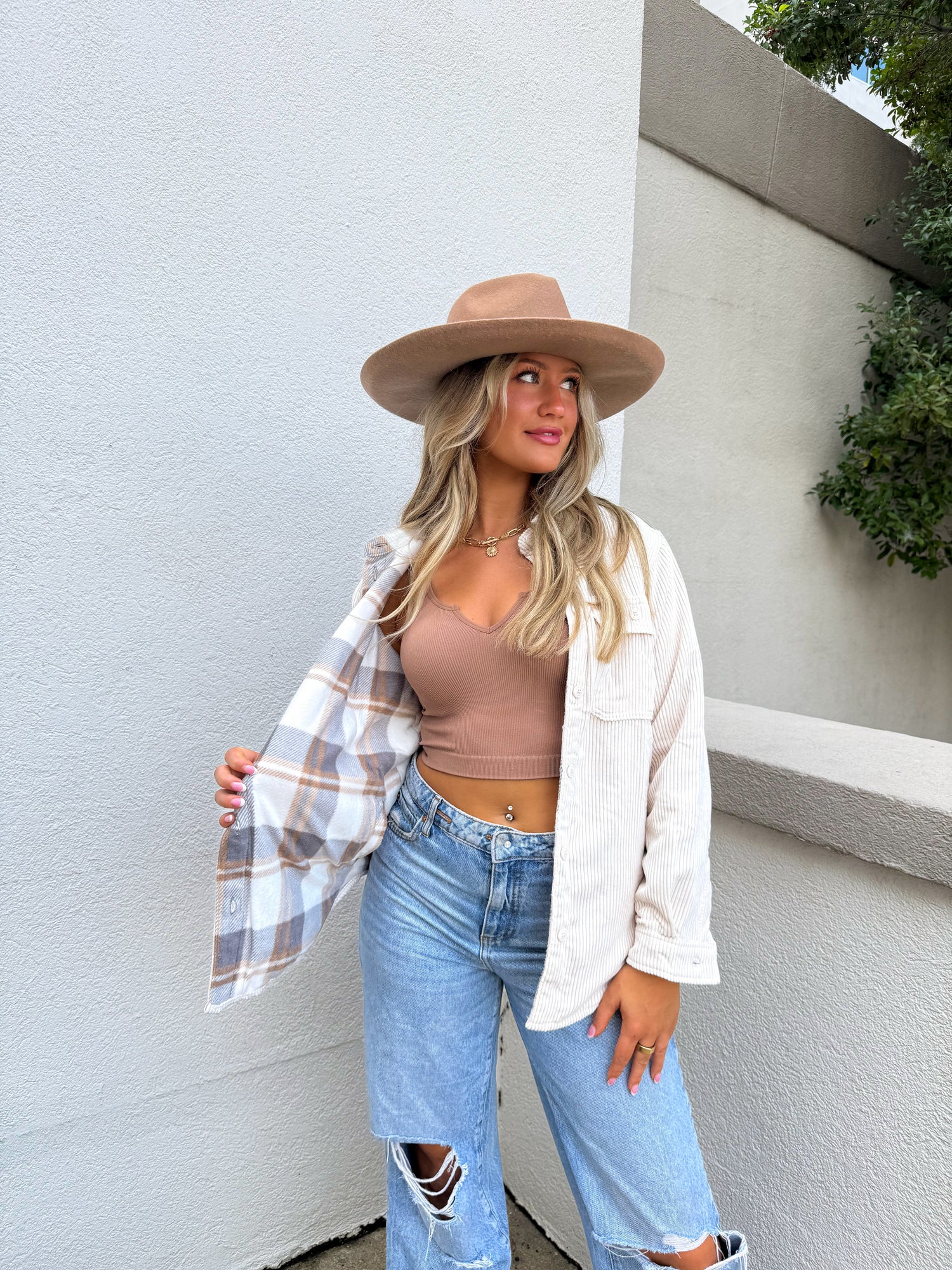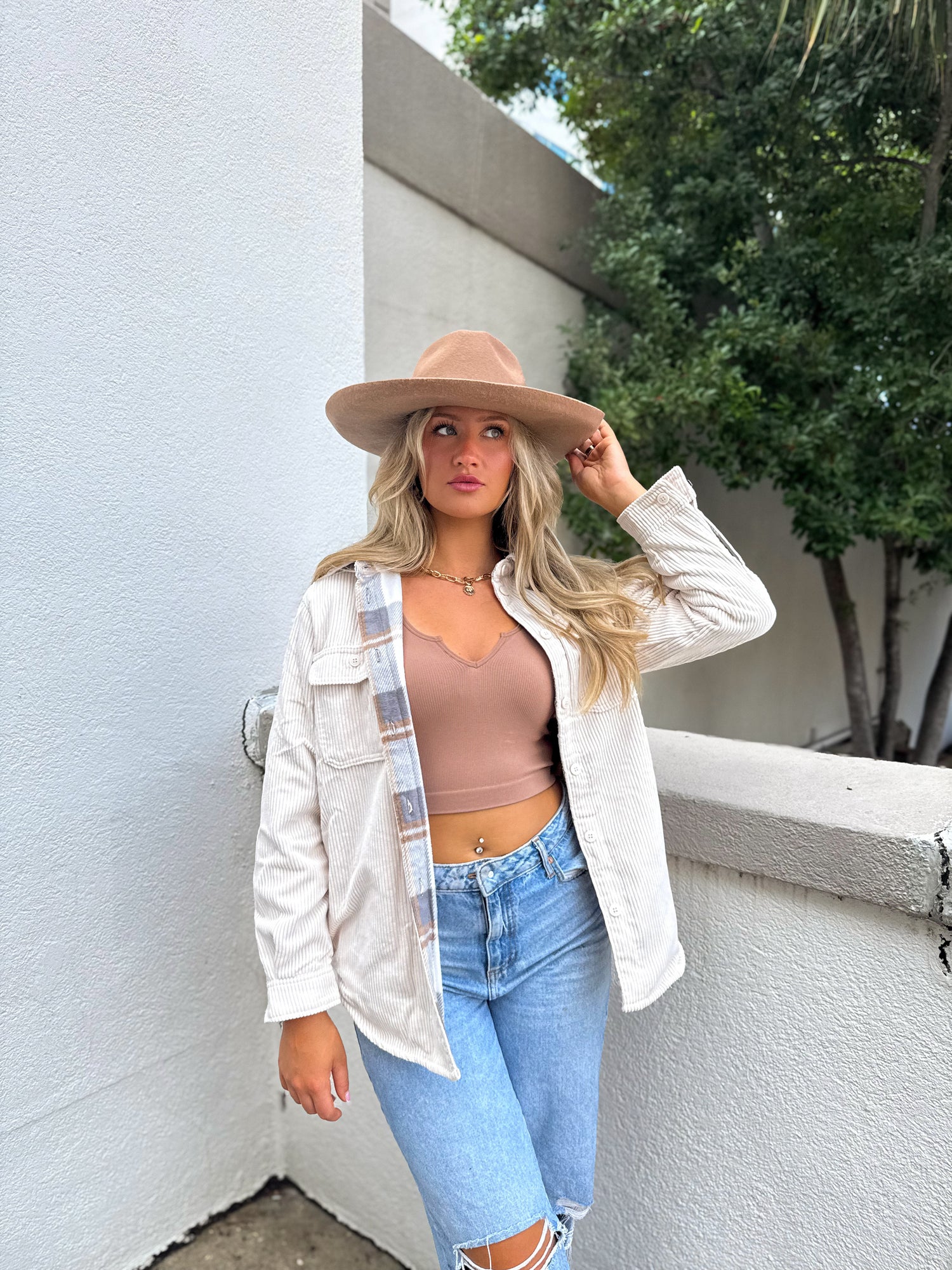 Two looks in one — the Fall Back Reversible Corduroy Shacket is the ultimate fall essential. One side features soft neutral corduroy for a laid-back vibe, while the inside reveals a warm plaid flannel for a cozy, classic twist. Designed with a relaxed fit and button-front detail, this jacket is perfect for layering over tanks, knits, or graphic tees. Pair with denim and boots for a casual day out, or flip to the flannel side for a cabin-ready look.