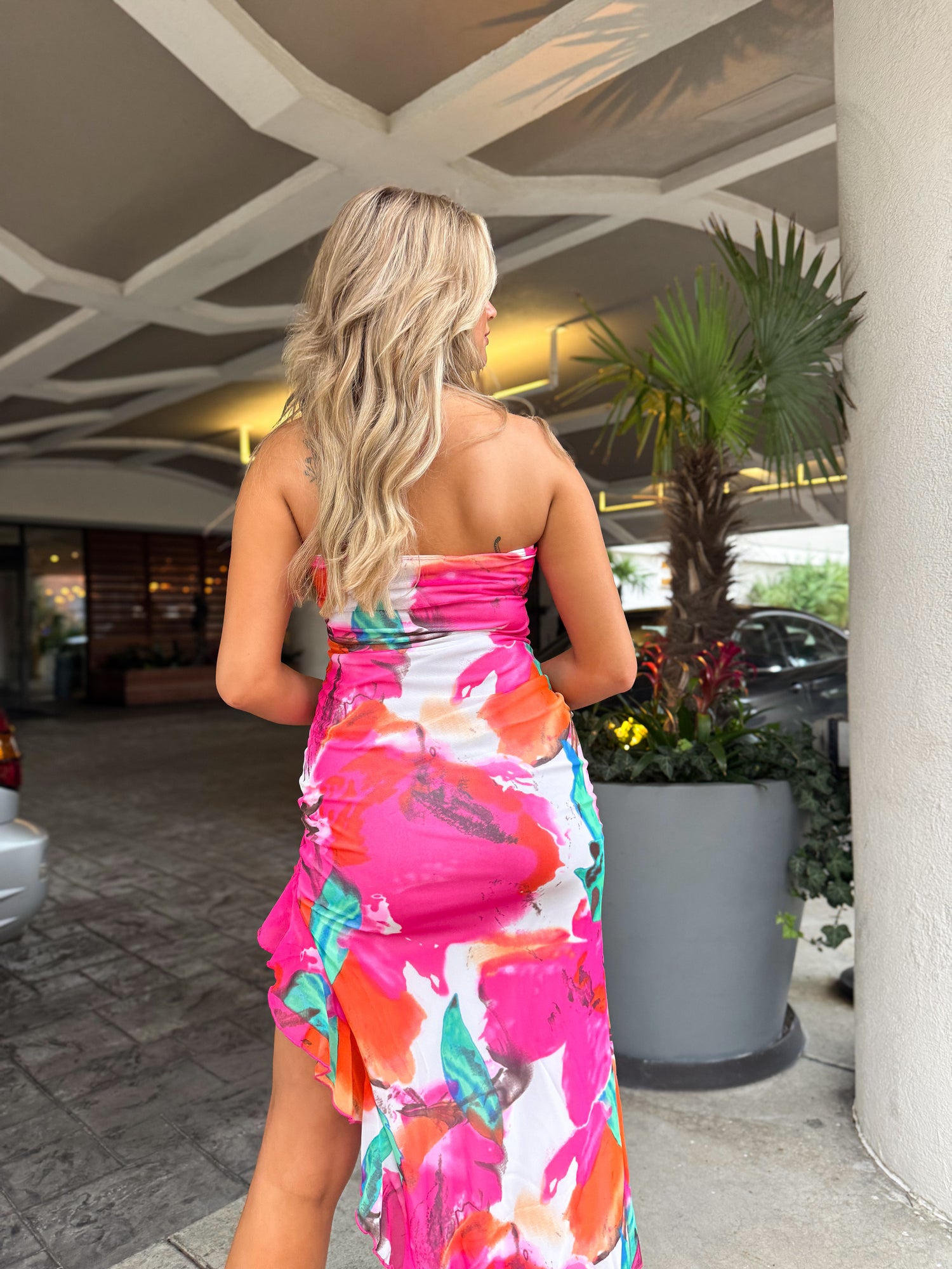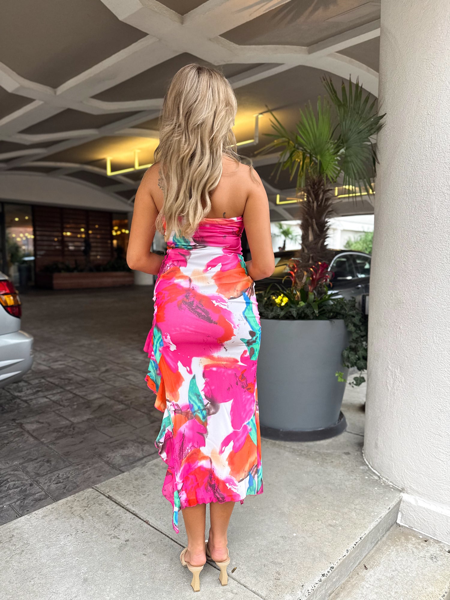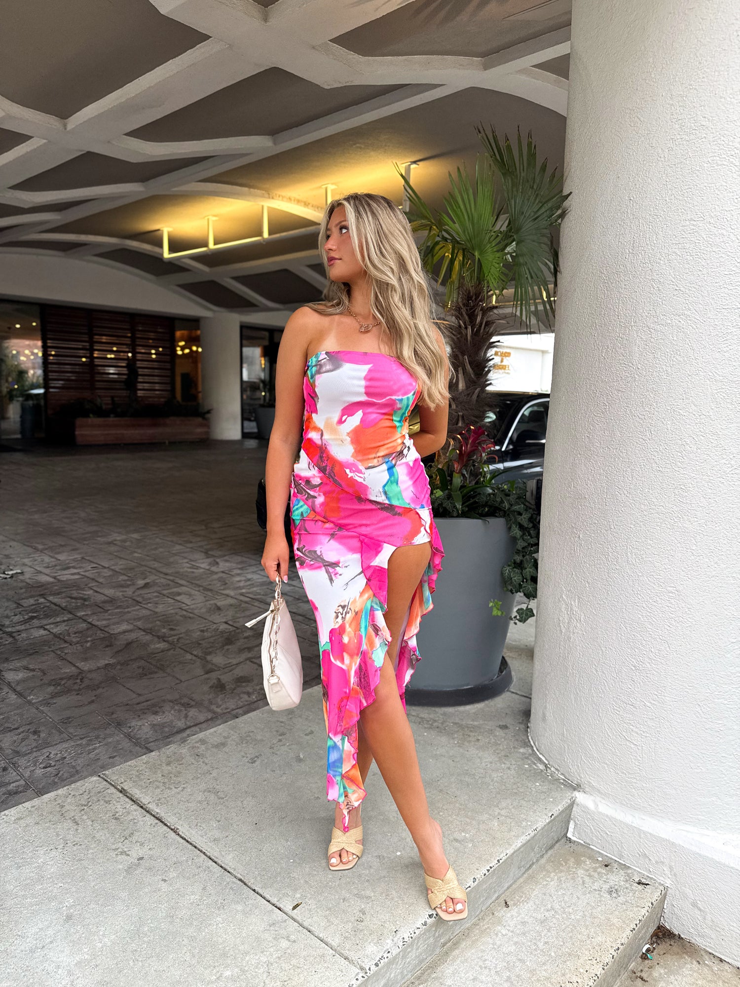 Bring the heat in the Samba Nights Dress — a vibrant, body-hugging dress made for your next getaway. This bold beauty features an eye-catching tropical print in vivid pinks, greens, and sunset tones that instantly transport you to island nights and beachside cocktails. The fitted silhouette hugs in all the right places thanks to its stretchy, double-lined fabric, while a side slit with ruffle trim adds movement and a little drama.