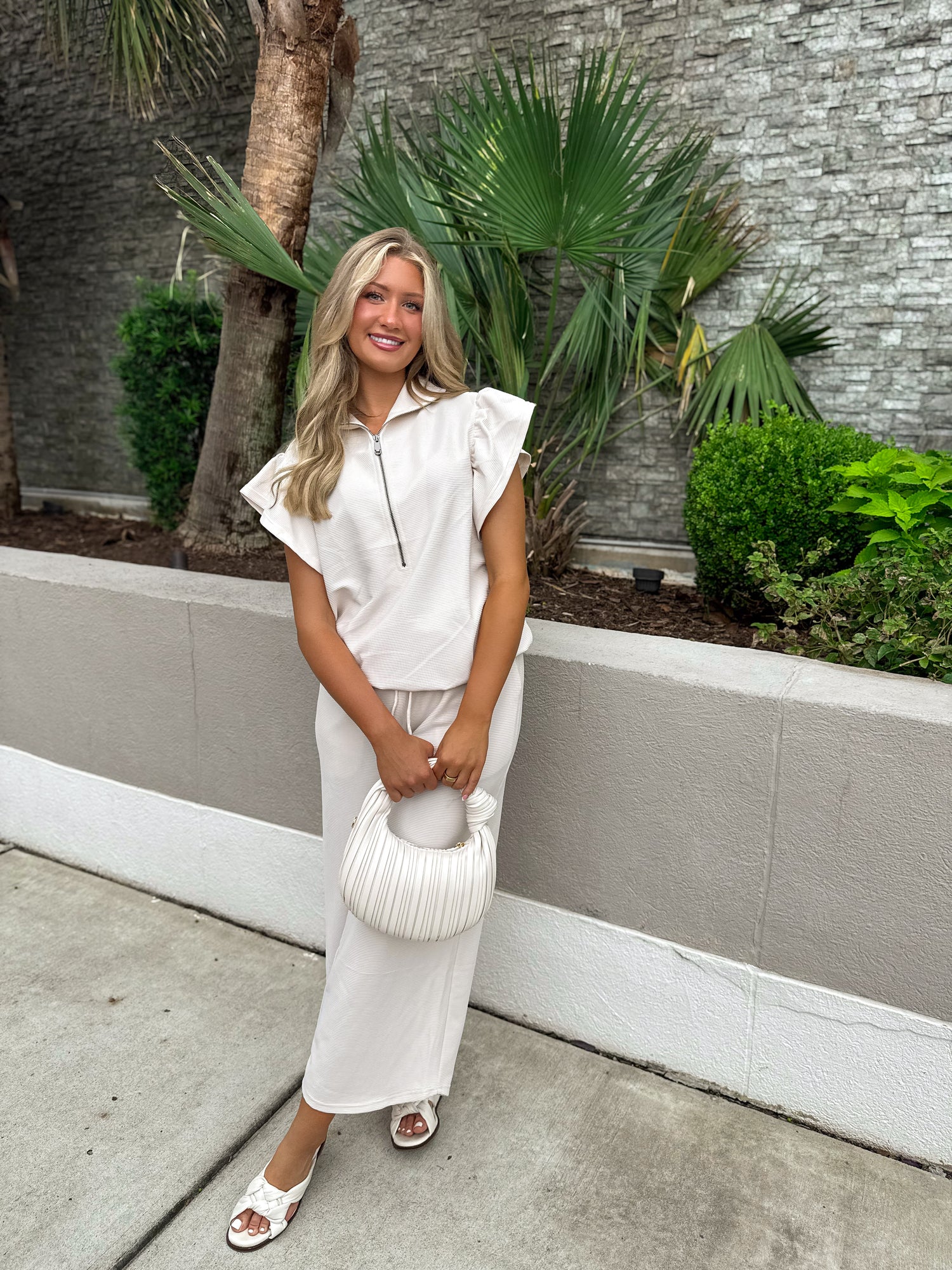 Effortless meets elevated. ๐ค This two-piece set is the perfect transition look as we move into fall. Featuring a flutter sleeve zip-front top and wide-leg pants with an adjustable drawstring waist, itโs designed for comfort while still keeping things chic. The soft neutral tone makes it easy to pair with fall layers โ think a denim jacket, cozy cardigan, or your favorite boots.