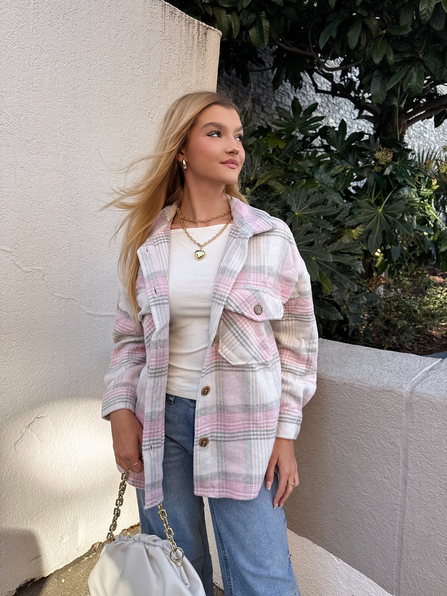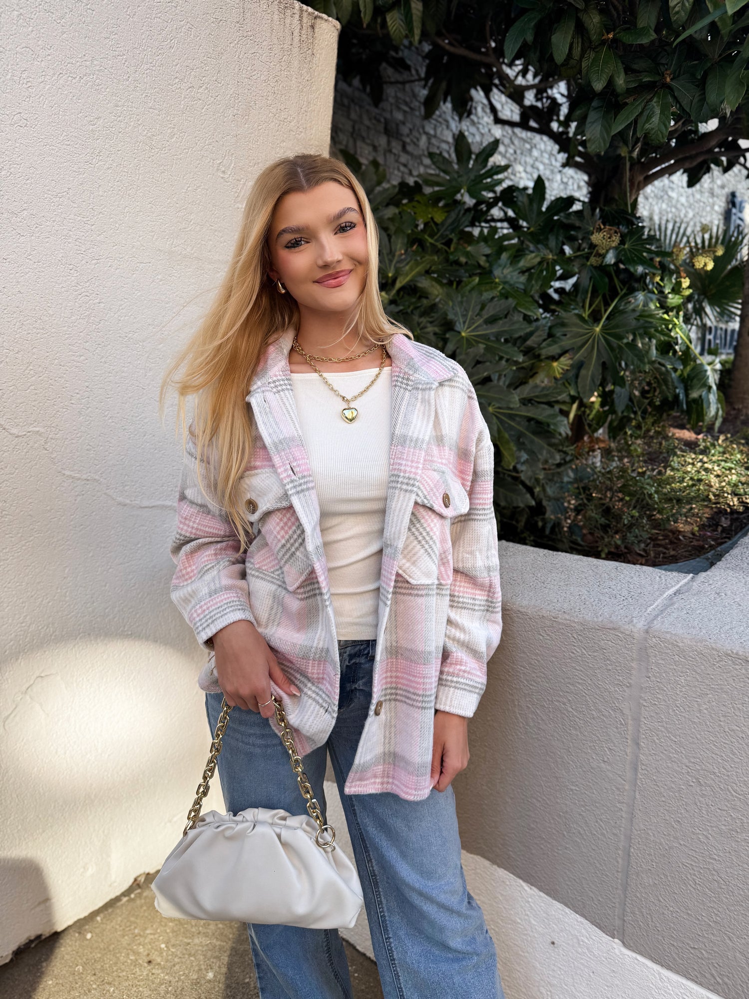 Meet your new go-to layering piece 🤍 This soft blush plaid shacket is the perfect blend of cozy and cute. Featuring a lightweight brushed fabric, neutral pink and gray tones, and classic button-front styling, it’s easy to throw on over tanks, tees, or sweaters. The relaxed fit and functional chest pockets make it both flattering and practical—ideal for everyday wear.